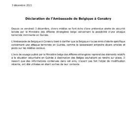Dans un communiqué dont copie a été transmise à Mediaguinee, l’ambassade de Belgique à Conakry indique n’avoir pas émis...