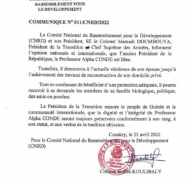 Dans un communiqué lu hier à la télévision nationale, signé depuis le 21 avril, le CNRD, la junte au pouvoir informe qu’Alpha Condé...