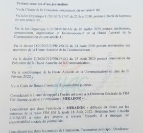 La Haute Autorité de la Communication (HAC) a suspendu vendredi le journaliste Ibrahima Lincoln Soumah de Fim fm de toutes les émissions...
