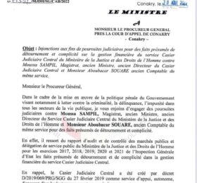 Dans une lettre adressée au procureur général près la Cour d’appel de Conakry, le ministre de la Justice, Garde des sceaux, Alphonse...