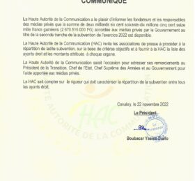 Dans un communiqué, le président de la Haute autorité de la Communication (HAC) Boubacar Yacine Diallo annonce disponible le montant de...