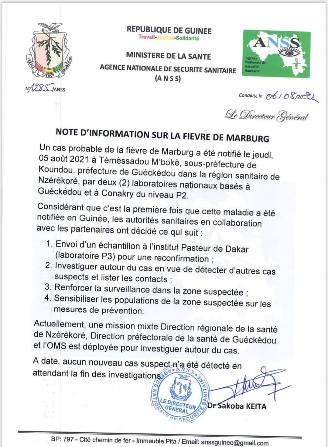 L’article Guéckédou : un cas probable de la fièvre de Marburg notifié, hier jeudi est apparu en premier sur Mediaguinee.org.