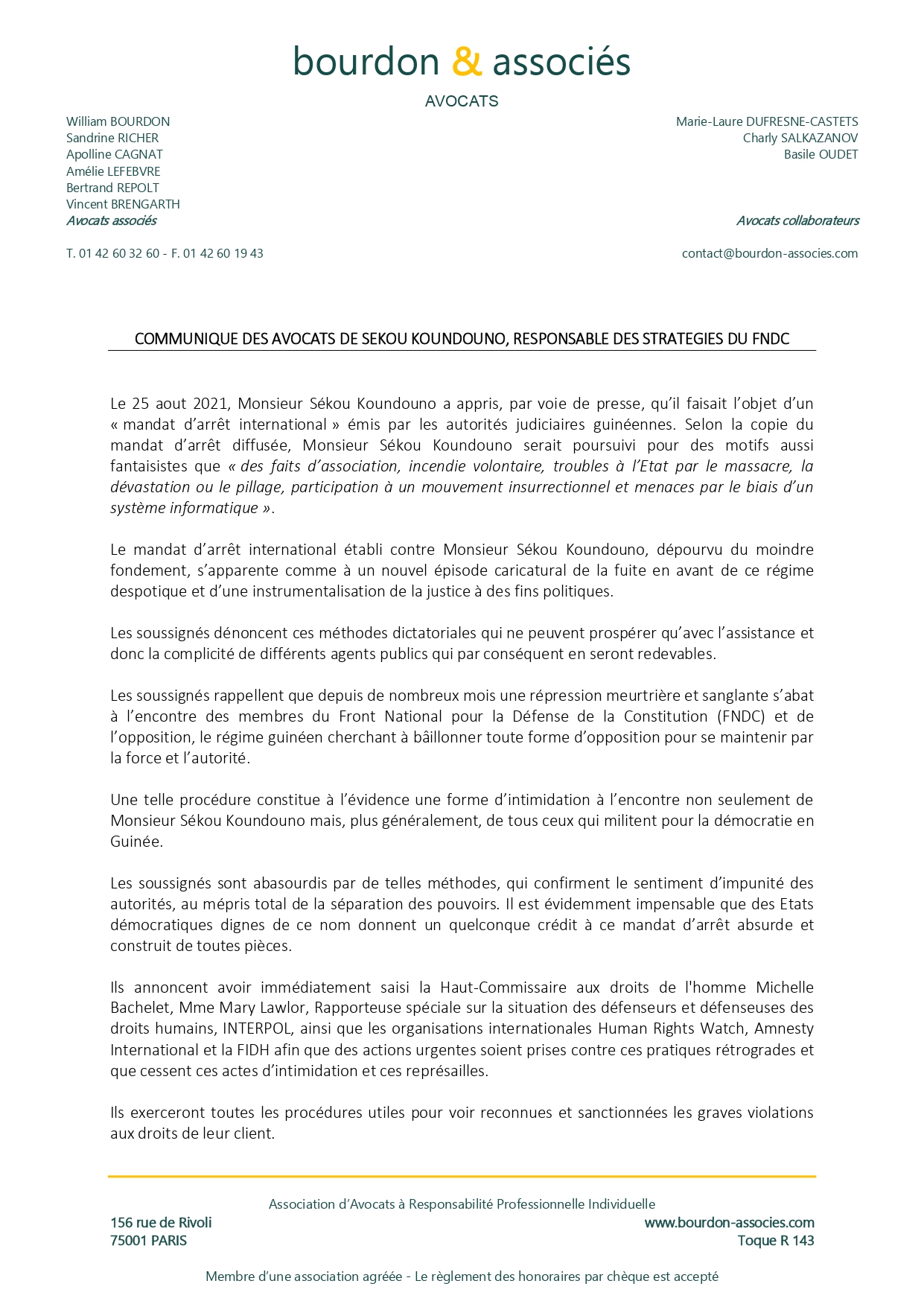 Les avocats de Sékou Koundouno, un des responsables du Front national pour la défense de la constitution (fndc)-contre qui un mandat d’arrêt international a été émis par la justice- disent avoir saisi entre autres la Haut-commissaire aux Droits de l’Homme et Interpol…