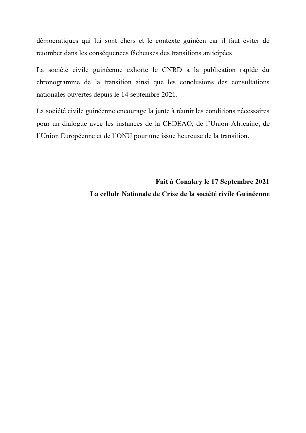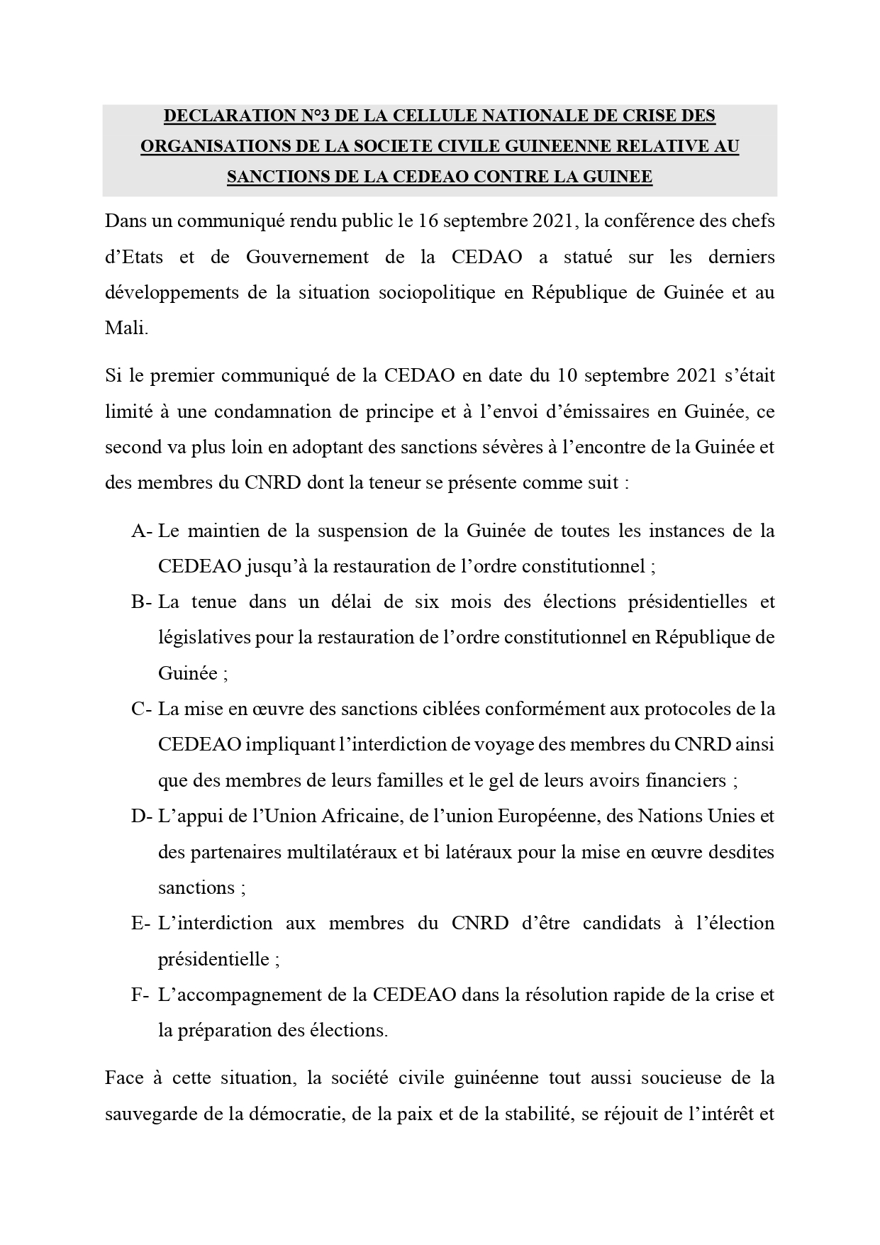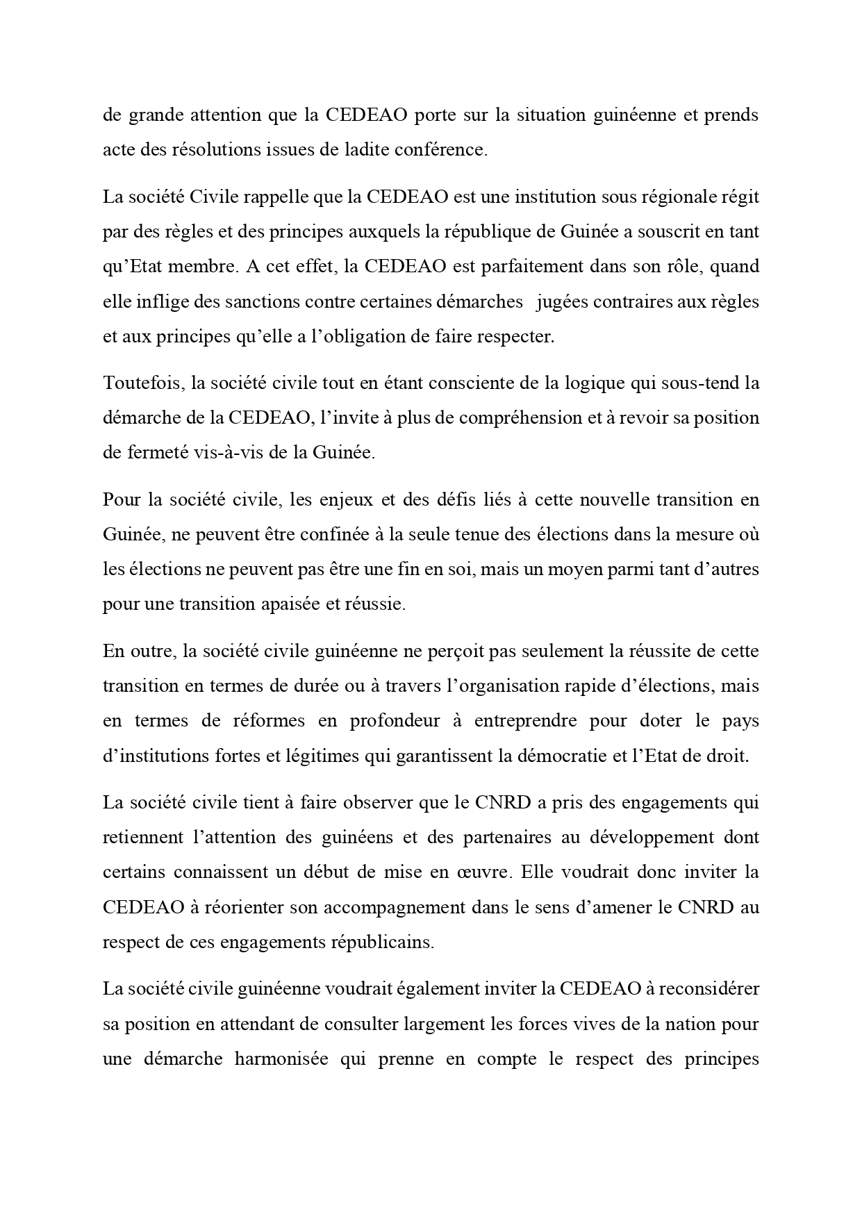 Les dures sanctions de la Cedeao contre la junte sont très prises au sérieux en Guinée. Dans une déclaration dont copie a été transmise à Mediaguinee, le Conseil national des organisations de la société civile guinéenne (CNOSCG) -dirigé par Dr Dansa Kourouma a invité l’organisation sous-régionale à revoir sa position de fermeté vis-à-vis de la Guinée et exhorté la junte à publier rapidement le chronogramme de la transition. Déclaration…