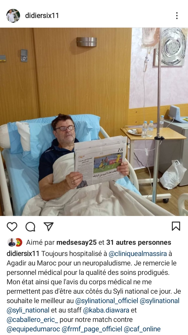 « Toujours hospitalisé à Agadir pour un neuropaludisme. Je remercie le personnel médical pour la qualité des soins prodigués. Mon état aisni que l’avis du corps médical ne me permettent pas d’être aux côtés du Syli ce jour. Je souhaite le meilleur au syli et au staff pour notre match contre le Maroc » a posté Didier Six sur son compte Instagram. Cette sortie de Didier Six laisse dire que le sélectionneur n’est jamais sur la même longueur d’informations que la fédération. Ce démenti jette un discrédit sur ces responsables de com du syli.