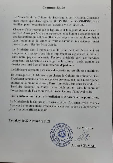 La guerre des structures (COMIGUI et COOMISGUI) pour l’organisation du concours de beauté « Miss Guinée » naura pas lieu. En tout cas, si l’on s’en tient au communiqué signé du ministre de la Culture, du tourisme et de l’artisanat Alpha Soumah « Bill De Sam » qui a décidé de l’arrêt immédiat de toutes les activités liées à l’organisation de l’élection Miss Guinée « jusqu’à nouvel ordre »