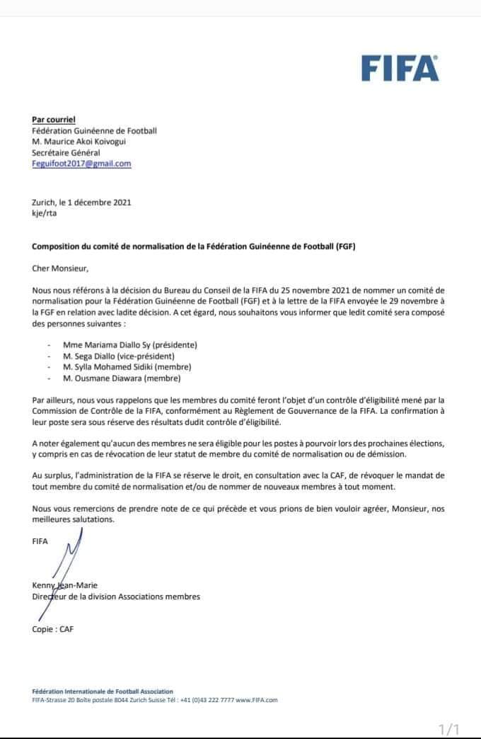 La FIFA a dévoilé les noms des membres du comité de normalisation installé au sein de la fédération guinéenne de football.