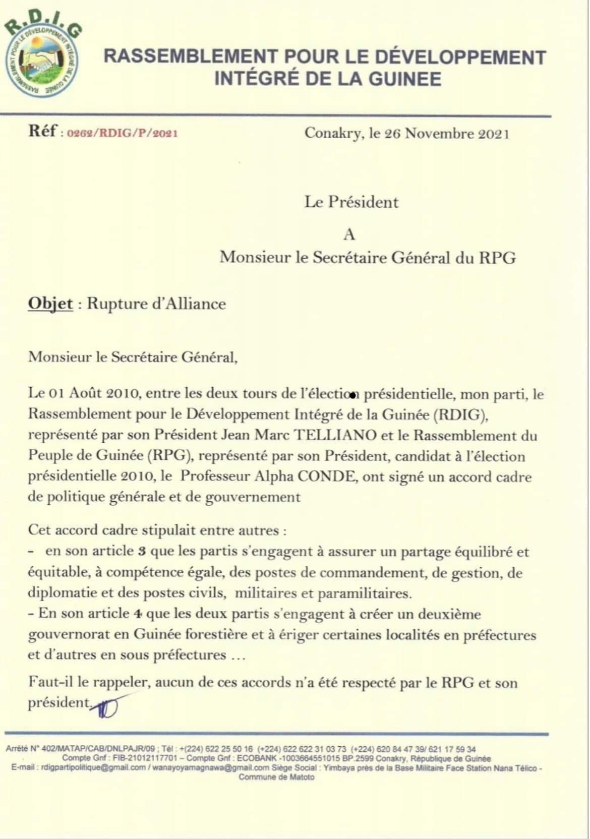 C’est fini entre le Rassemblement pour le développement intégré de Guinée (RDIG) de Jean Marc Telliano et le Rassemblement du peuple de Guinée (RPG), ancien parti au pouvoir.