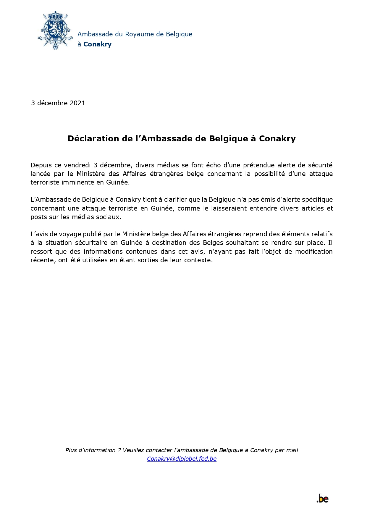 Dans un communiqué dont copie a été transmise à Mediaguinee, l’ambassade de Belgique à Conakry indique n’avoir pas émis d’alerte spécifique concernant une attaque terroriste en Guinée