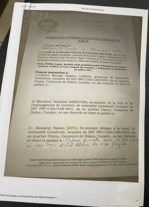 Trois cadres dont deux anciens ministres sommés de quitter les maisons qu’ils occupent à Dixinn. Il s’agit du Colonel Moussa Tiegboro Camara, secrétaire général à la présidence chargé des spéciaux, de la lutte contre la drogue, le crime organisé ; MM. Ibrahima Bangoura, ex ministre de la Ville et de l’Aménagement du territoire et Naman Keita, ex ministre délégué à la Santé.