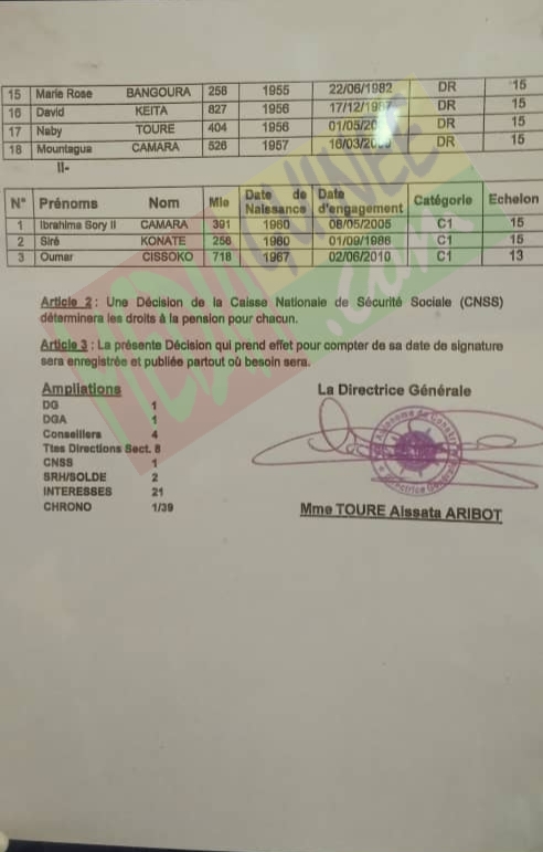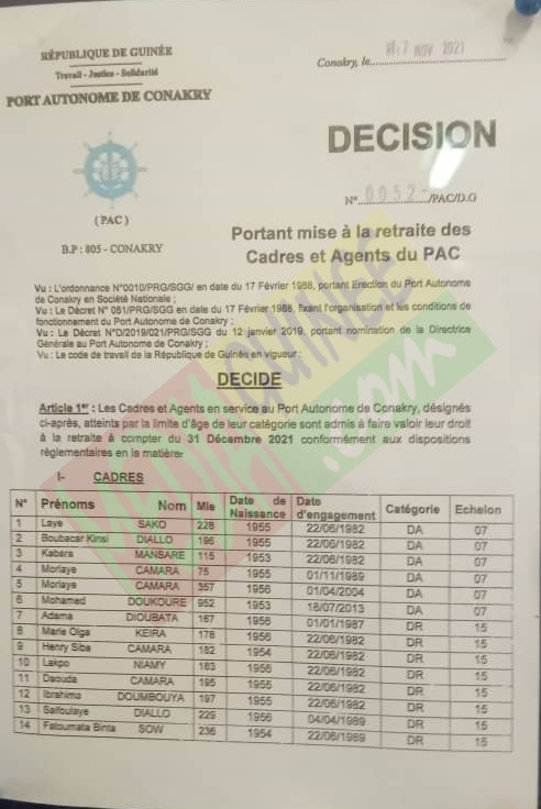 Vous avez dit retraite ? Dans une décision signée de la directrice générale du Port autonome de Conakry (PAC), 21 cadres et agents atteints par la limite d’âge admis à faire valoir leur droit à la retraite