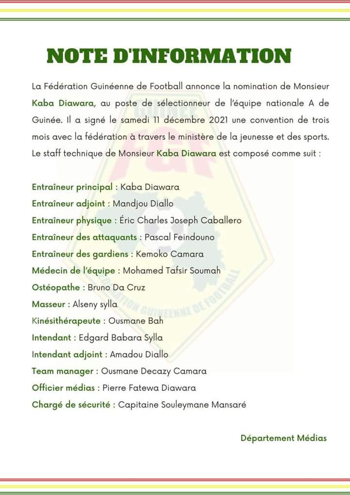 Ainsi, on note la nomination de Pascal Feindouno comme entraîneur des attaquants, lui qui est pourtant milieu de terrain. Édgard Babara Sylla fait son retour et jouera encore le rôle d’intendant de l’équipe. Notre confrère Pierre Fatewa Diawara est désormais le nouvel officier média du Syli