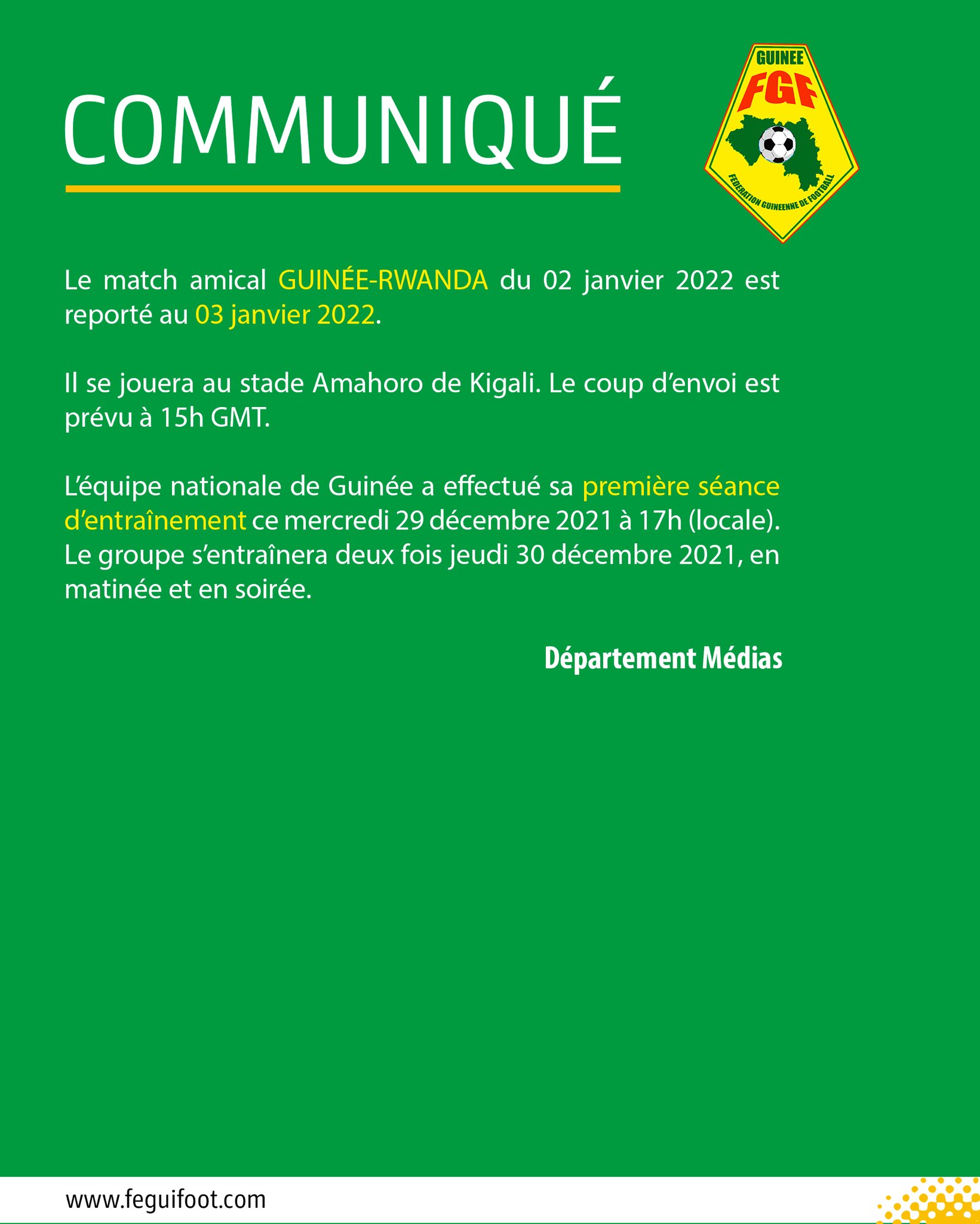 Alors que le premier match amical devait l’opposer au Rwanda le 2 janvier, cette rencontre aura désormais lieu le 3 janvier, précise le communiqué de la Féguifoot, qui confirme cependant que le second match se jouera bien le 6 janvier.