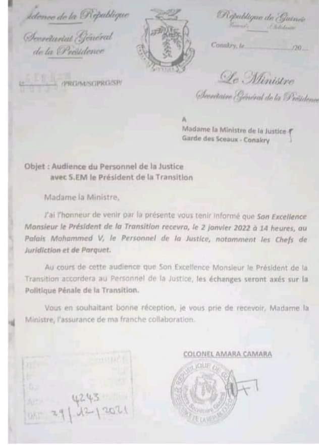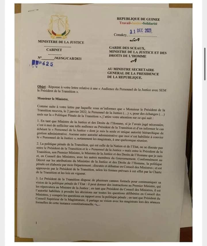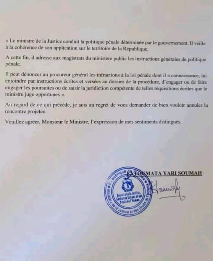 Le tout puissant ministre secrétaire général de la présidence, colonel Amara Camara, aurait bypassé la ministre de la Justice, Fatoumata Yarie, pour vouloir organiser une rencontre entre les magistrats et le président de la Transition. « Niet », a retorqué la ministre qui apparemment à la niaque. La preuve à travers les courriers ci-dessous largement diffusés sur les réseaux sociaux.