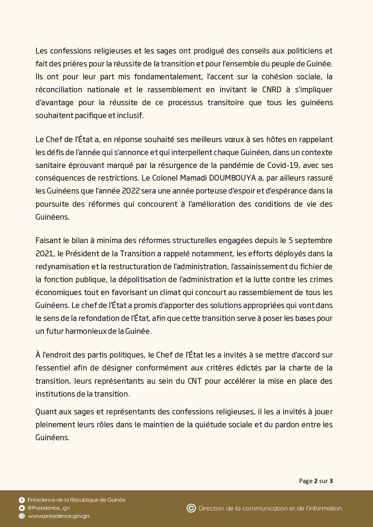 Le président de la transition colonel Mamadi Doumbouya a échangé samedi, 15 janvier avec les acteurs politiques guinéens au palais Mohammed V sur la situation nationale dont la mise en place du futur Conseil national de la transition (CNT).