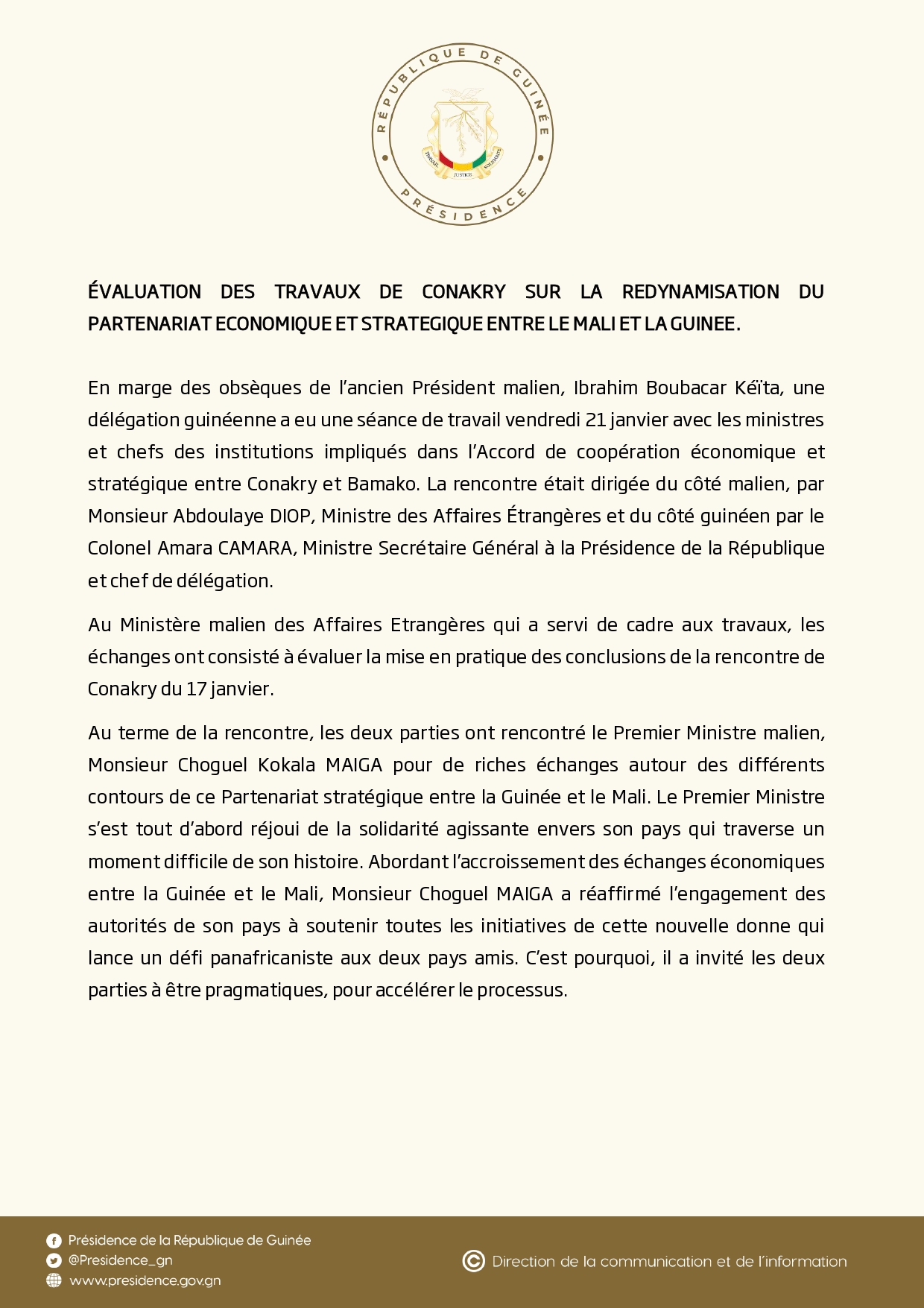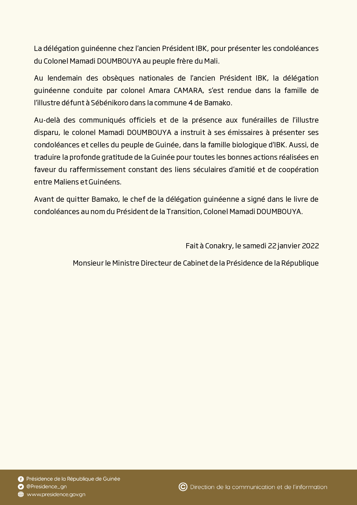 Le président de la transition colonel Mamadi Doumbouya a dépêché une forte délégation conduite par le ministre secrétaire général de la Présidence colonel Amara Camara pour présenter les condoléances au peuple et au gouvernement du Mali suite au décès de l’ancien président Ibrahim Boubacaf Keita (IBK).