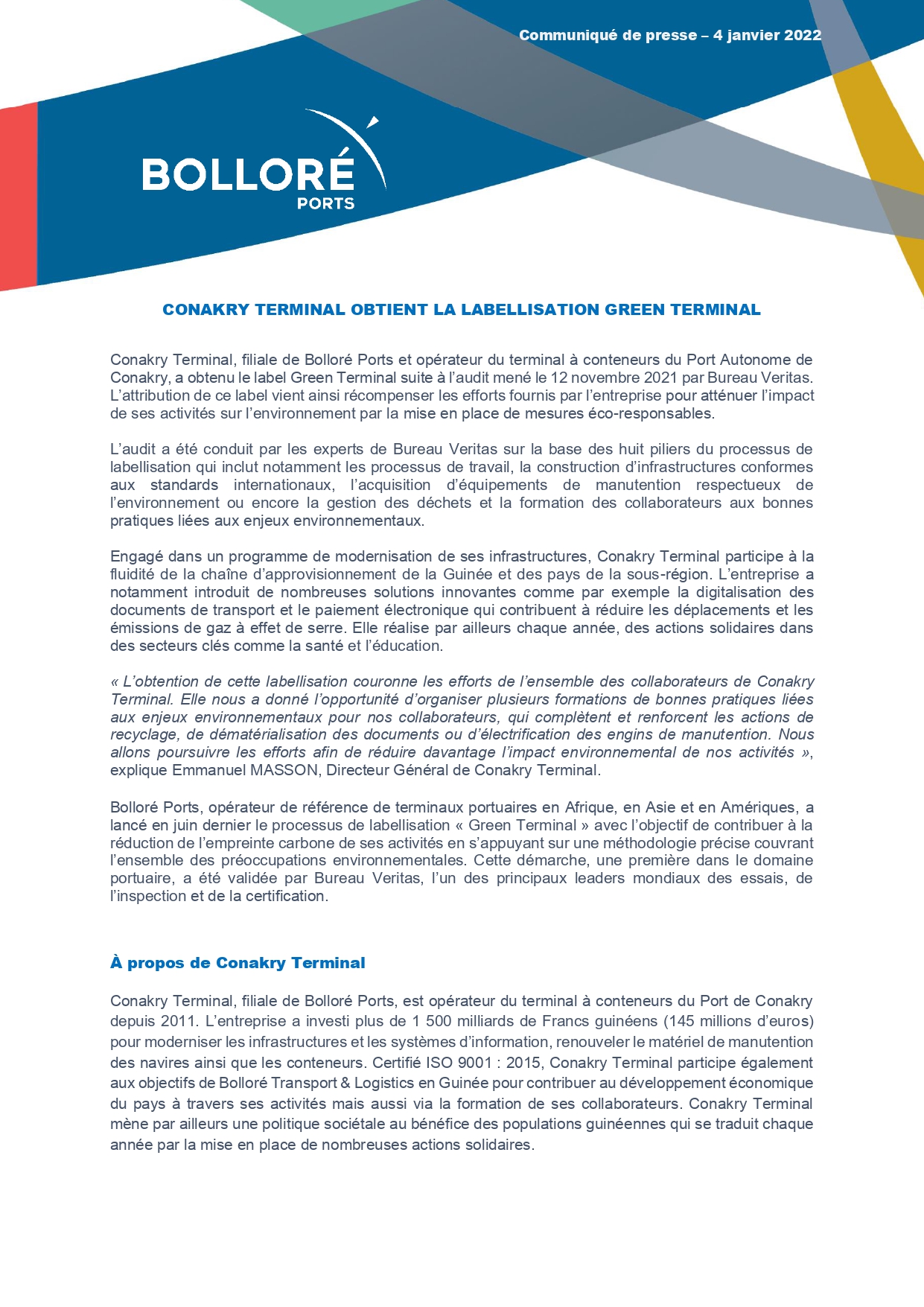 Conakry Terminal, filiale de Bolloré Ports et opérateur du terminal à conteneurs du Port Autonome de Conakry, a obtenu le label Green Terminal suite à l’audit mené le 12 novembre 2021 par Bureau Veritas.