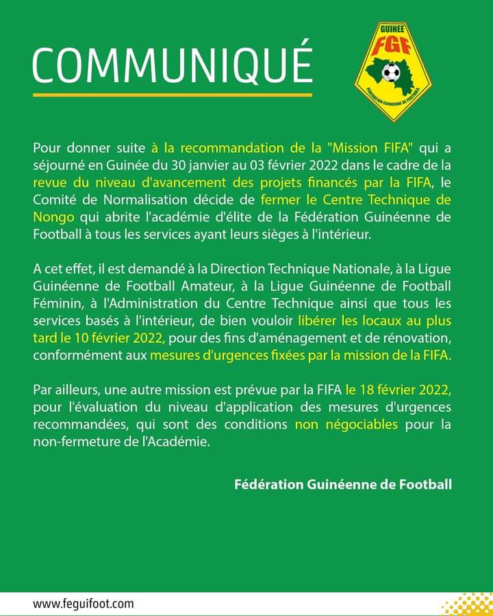 Une autre mission est prévue par la FIFA le 18 février prochain pour l’évaluation du niveau d’application des mesures d’urgences recommandées qui sont des conditions non négociables pour la non-fermeture de l’Académie, précise ledit communiqué.