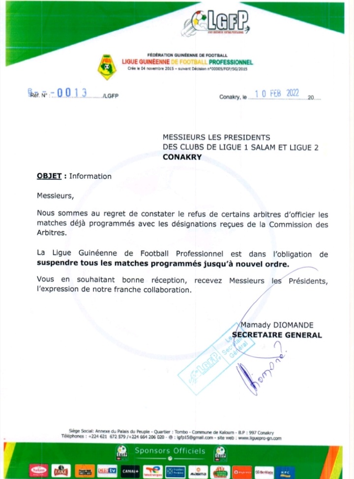CONAKRY- A la suite de la grève des arbitres guinéens qui réclament une meilleure prise en charge, l’amélioration de leurs conditions de vie, et un traitement plus décent, la Ligue guinéenne de Football Professionnel (LGFP), est dans l’obligation de suspendre provisoirement championnats guinéens de Ligue 1 et Ligue 2 de football.
