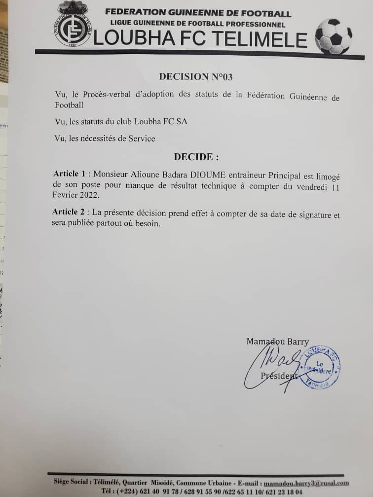 CONAKRY- Dans un court communiqué publié par la direction du club, le Loubha FC de Télimélé annonce la fin de collaboration avec son entraîneur Alioune Badara Dioume. Le sénégalais, arrivé en début de saison en Guinée et au Loubha FC, n’a pas réussi à convaincre les dirigeants de la maintenir aussi longtemps.