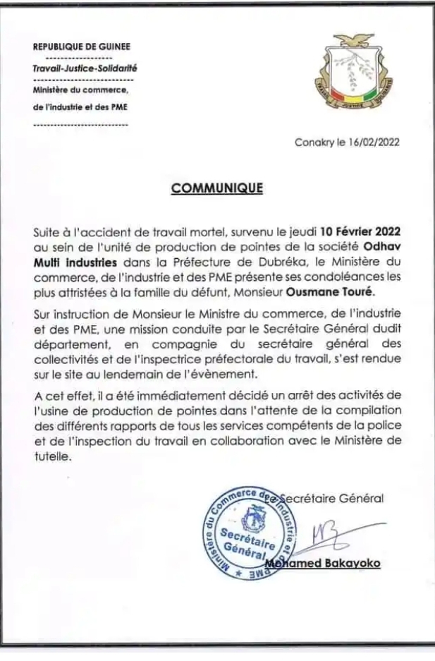 A travers un communiqué rendu public, mercredi 16 février, le ministère du Commerce, de l’industrie et des PME a ordonné l’arrêt immédiat des activités au sein de l’unité de production des pointes de la société Odhav multi industrie, dans la préfecture de Dubreka.