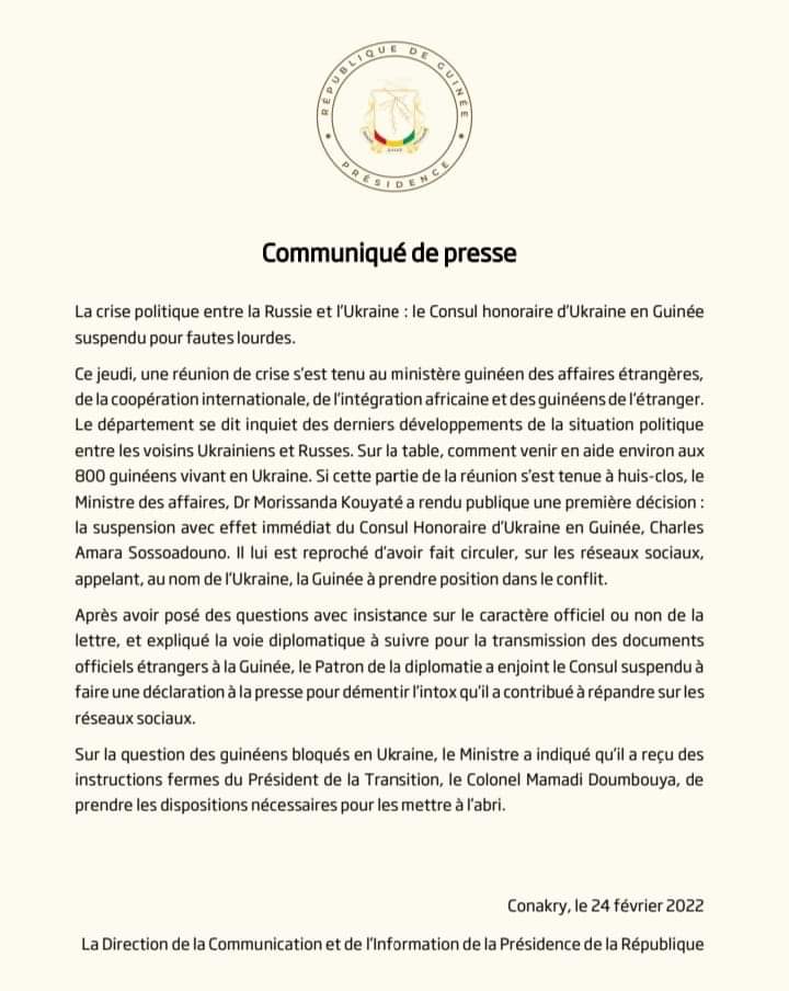 Si cette partie de la réunion s’est tenue à huis-clos, le ministre des Affaires, Dr Morissanda Kouyaté a rendu publique une première décision: la suspension avec effet immédiat du Consul Honoraire d’Ukraine en Guinée, Charles Amara Sossoadouno. Il lui est reproché d’avoir fait circuler, sur les réseaux sociaux, appelant, au nom de l’Ukraine, la Guinée à prendre position dans le conflit.