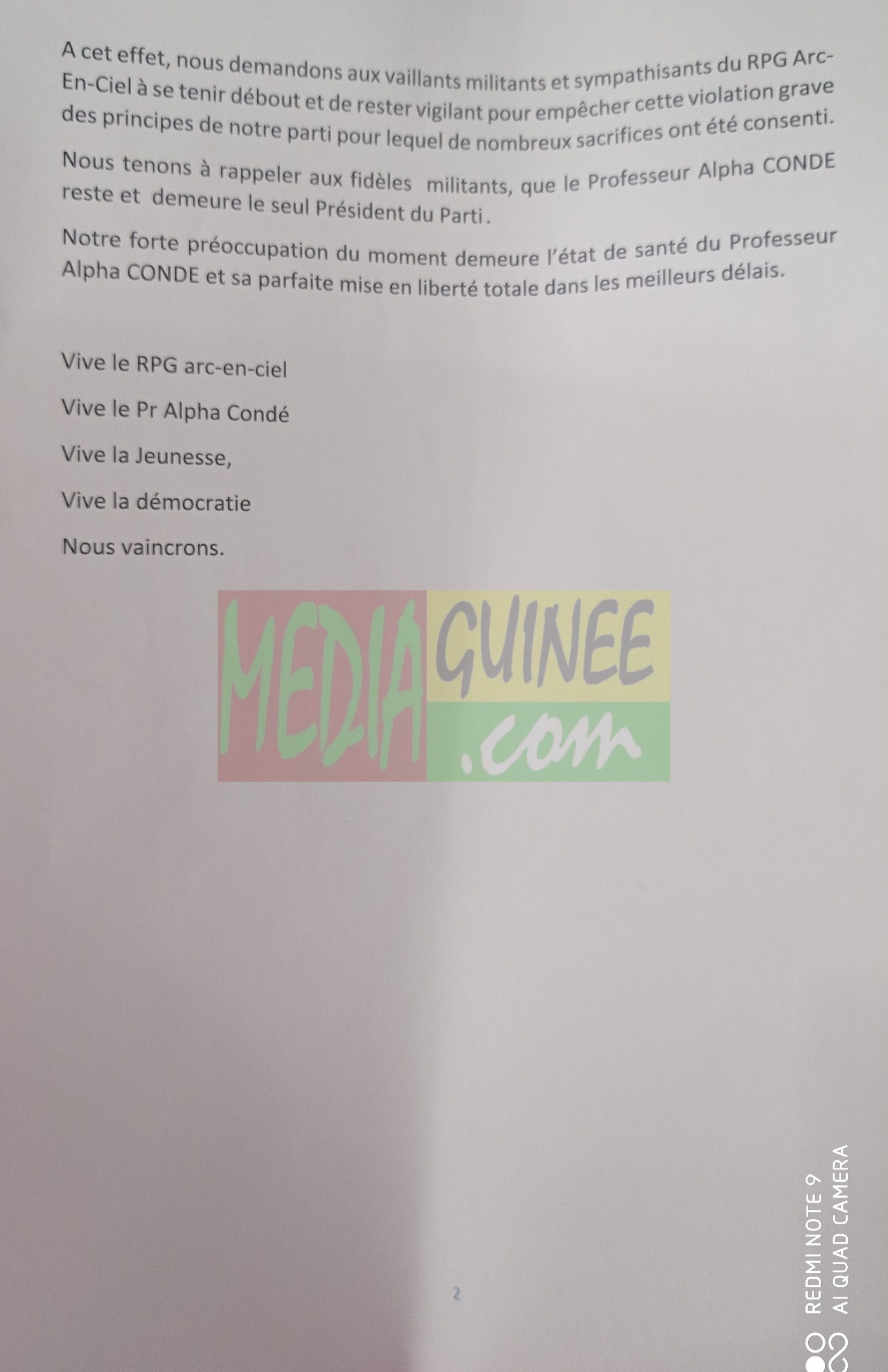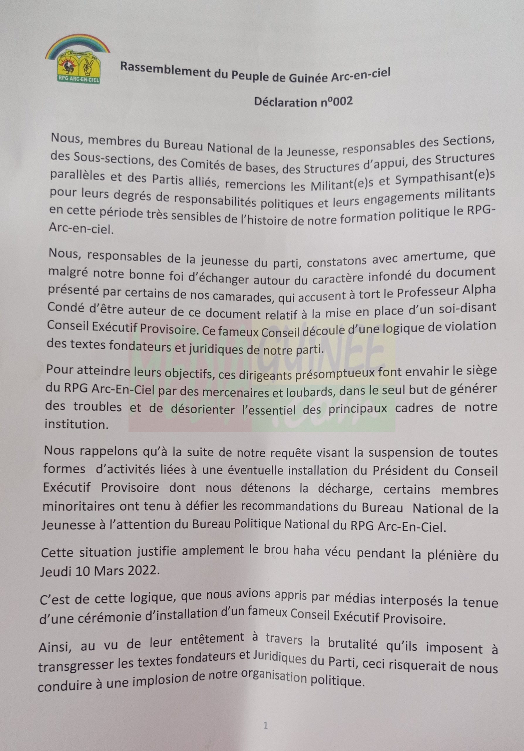 Dans une déclaration lue ce mardi 16 mars 2022 à Kipé, la jeunesse du RPG arc-en-ciel s’est prononcée sur la mise en place du Conseil Exécutif Provisoire. À en croire ces jeunes, le Professeur Alpha Condé ne pourrait être l’auteur du document relatif à la mise en place du Conseil Exécutif Provisoire découlant selon eux d’une logique de violation des textes fondateurs et juridiques du parti.