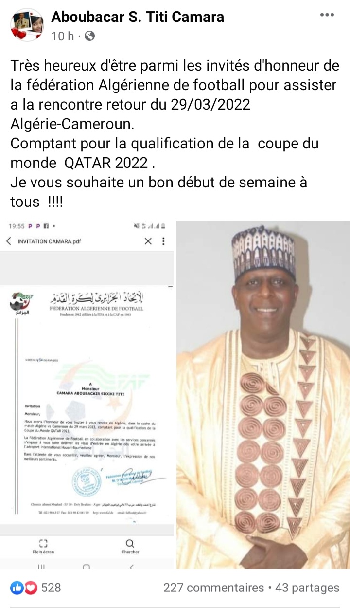 C’est dans ce cadre que la légende vivante du football guinéen Aboubacar Titi Camara est invité spécial de la fédération algérienne de football pour le match contre les Lions indomptables du Cameroun. C’est du moins l’information donnée par l’ancien capitaine du Syli National de Guinée sur sa page Facebook. Il faut préciser qu’au match Aller, c’est l’Algérie qui s’était imposée sur le score de (1-0) grâce à un but d’Islam Slimani.