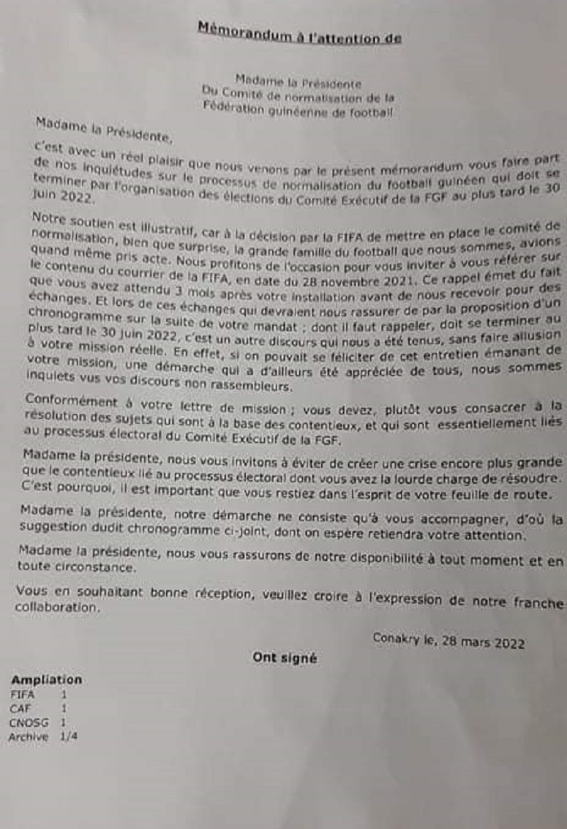 Dans une lettre en date du 28 mars 2022, plusieurs clubs de ligue 1 et 2 ont invité la présidente du Comité de normalisation, madame Mariama Satina Sy, a « accentué ses offres dans la résolution des sujets qui sont à la base des contentieux et qui sont essentiellement liés au processus électoral du bureau exécutif de la féguifoot. Ci-joint la lettre.