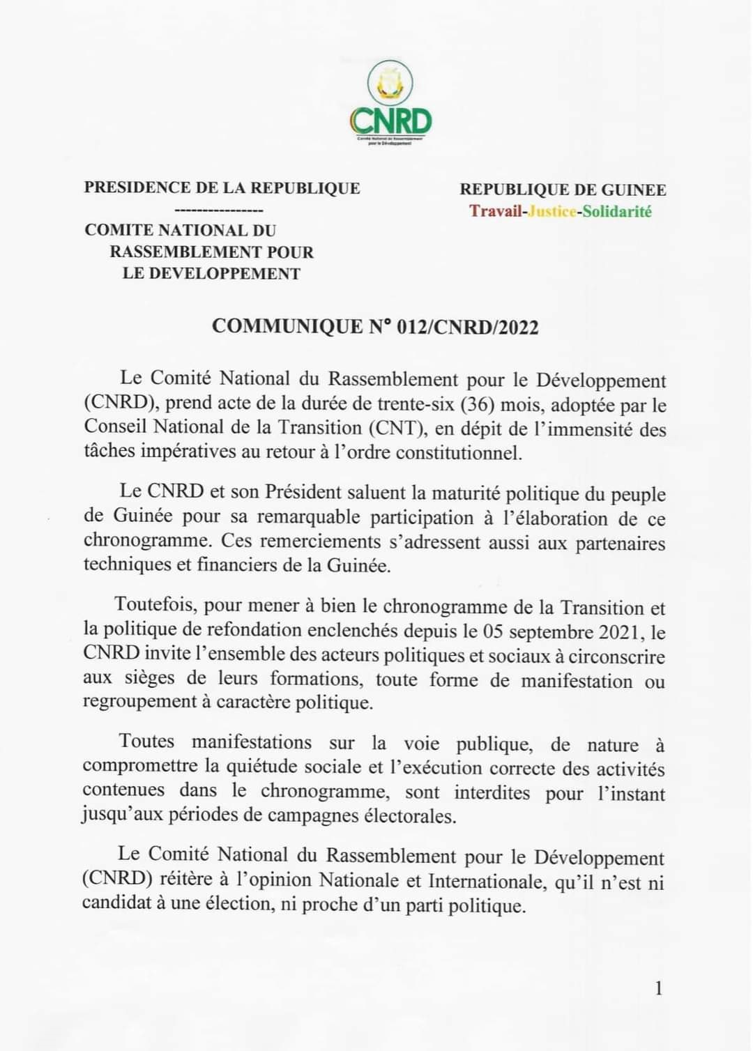 Le CNRD dit avoir pris acte de la durée de la transition telle qu’annoncée par le CNT, 36 mois. Et interdit aux partis politiques les manifestations de rue jusqu’aux prochaines campagnes électorales. Lire ci-dessous le communiqué.