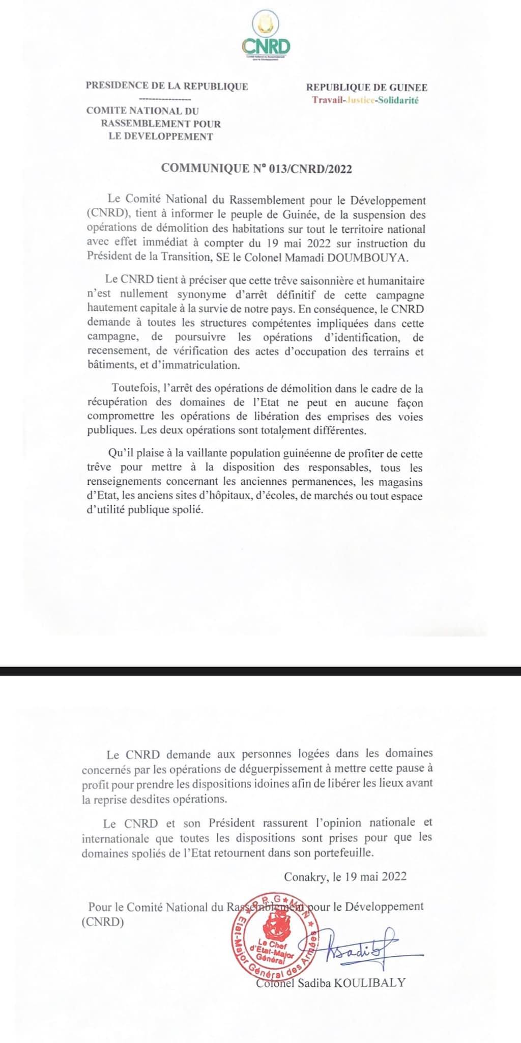 Le CNRD suspend les opérations de démolition mais poursuit les « opérations de libération des emprises de la route ». Lire ci-dessous le communiqué.