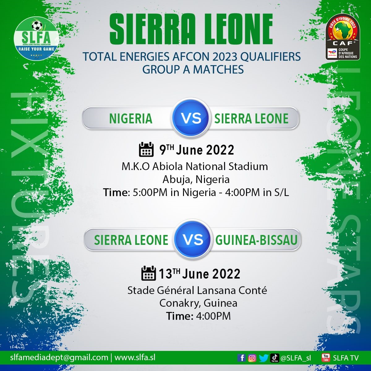 Comment comprendre que de Conakry, plusieurs interpellations aient été faites au niveau de la Confédération africaine de football sur « la qualité de l’infrastructure devant accueillir les matchs du Syli national » ? Autrement dit, le stade GLC de Nongo. Quelles chances avons-nous de gagner des matchs que nous recevons sur d’autres installations que les nôtres ? Ça dérange qui que le Syli joue à Conakry sur l’unique stade homologué de la Guinée ? Stade homologué OUI, car le dernier représentant guinéen en campagne africaine y a joué ses matchs, les matchs (à domicile) des éliminatoires de la Sierra Leone voisine sont programmés sur le même stade (Sierra Leone vs Guinée-Bissau le 13 juin), le Syli jusqu’à preuve du contraire a ses matchs à domicile programmés au GLC. Bien entendu, le stade est un édifice à entretenir…Et les travaux n’y manquent presque jamais.