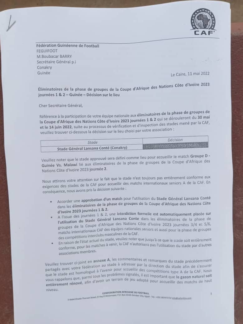 Ci-dessous, le courrier autorisant la réception des matchs des journées 1-2 des éliminatoires de la CAN 2023.