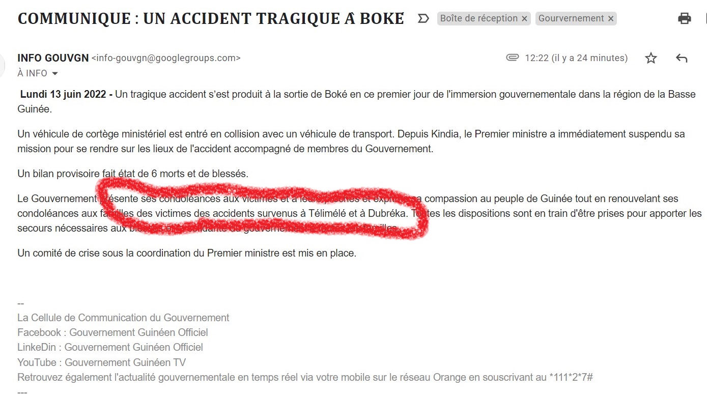 Du coup échaudé par les critiques de la presse et/ou peut-être, parce que l’accident concerne aussi un cortège gouvernemental ; le gouvernement avec une célérité inhabituelle, s’est fendu d’un communiqué dans lequel il s’est malheureusement planté. « Le Gouvernement présente ses condoléances aux victimes et à leurs proches et exprime sa compassion au peuple de Guinée tout en renouvelant ses condoléances aux familles des victimes des accidents survenus à Télimélé et à Dubréka », a-t-il écrit.