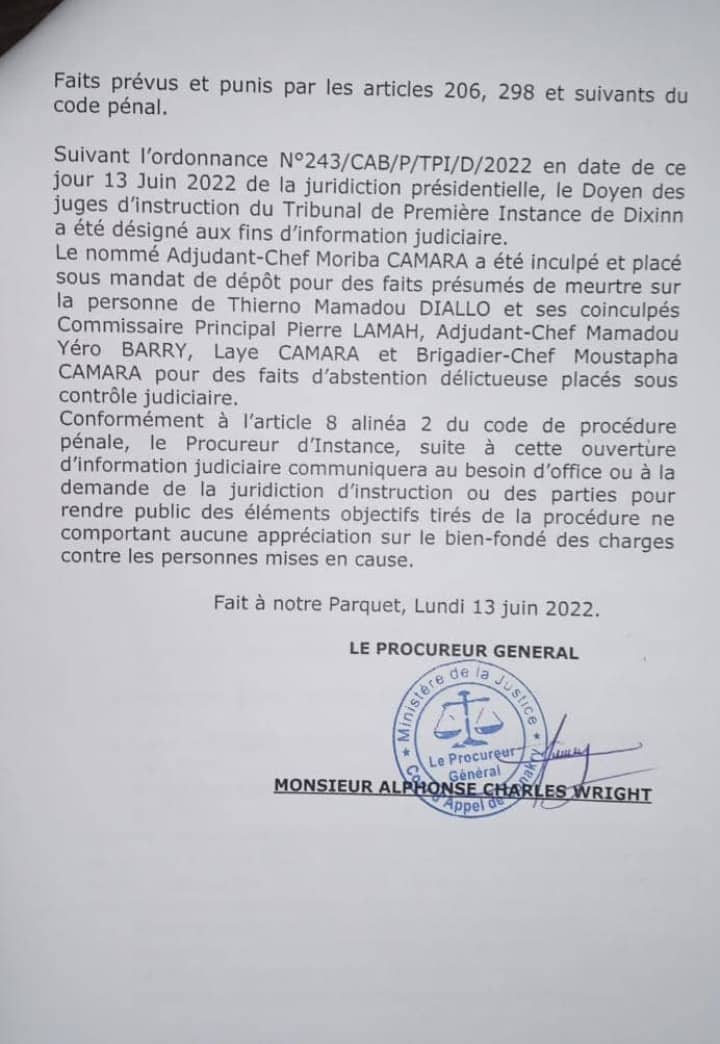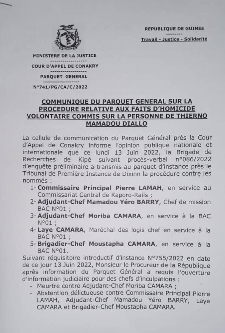 Dans un communiqué, le procureur général près la cour d’appel de Conakry, Alphonse Charles Wright, a instruit le tribunal de première instance de Dixinn, d’ouvrir une information judiciaire contre l’Adjudant-chef Moriba Camara pour « meurtre » de Thierno Mamadou et contre quatre autres policiers pour « abstention délicieuse ».