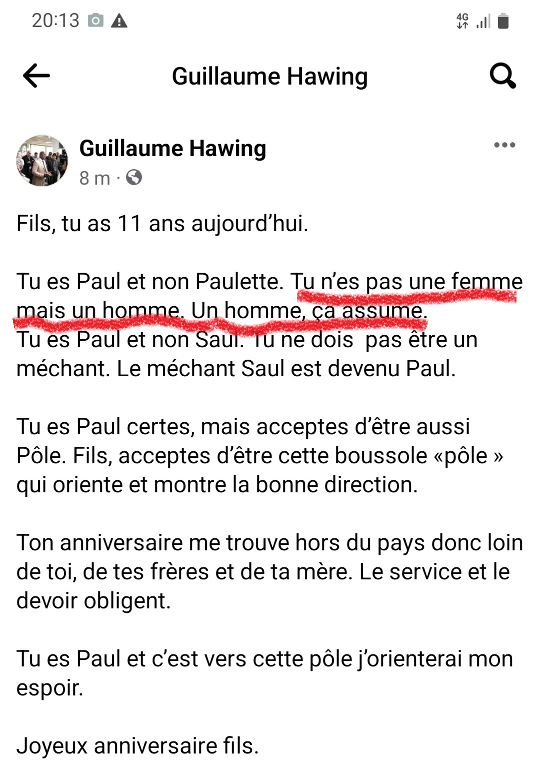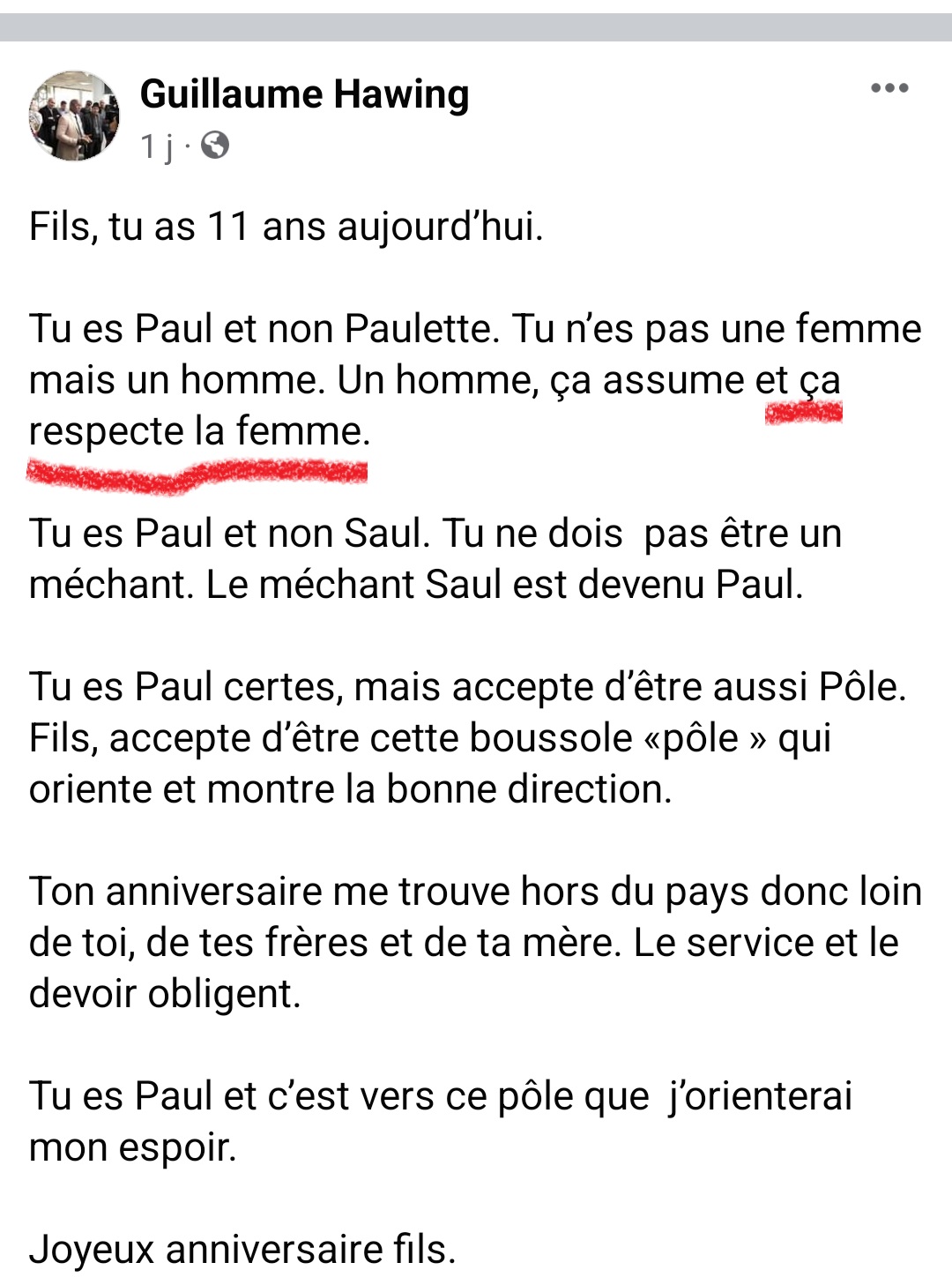 Le ministre Guillaume Hawing a fait un post à l’occasion des 11 ans de son garçon. A celui-ci, il a dit : Tu es Paul et non Paulette. Tu n’es pas une femme mais un homme. Un homme, ça assume.