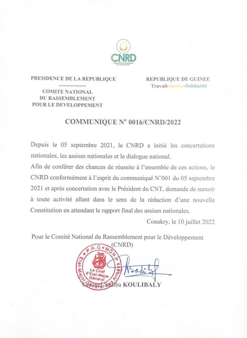 La rédaction de la nouvelle Constitution va attendre Dans un communiqué signé du colonel Sadiba Koulibaly, le CNRD, la junte au pouvoir en Guinée, « après concertation avec le président du CNT, demande de surseoir à toute activité allant dans le sens de la rédaction d’une nouvelle Constitution, en attendant les conclusions des assises nationales ».