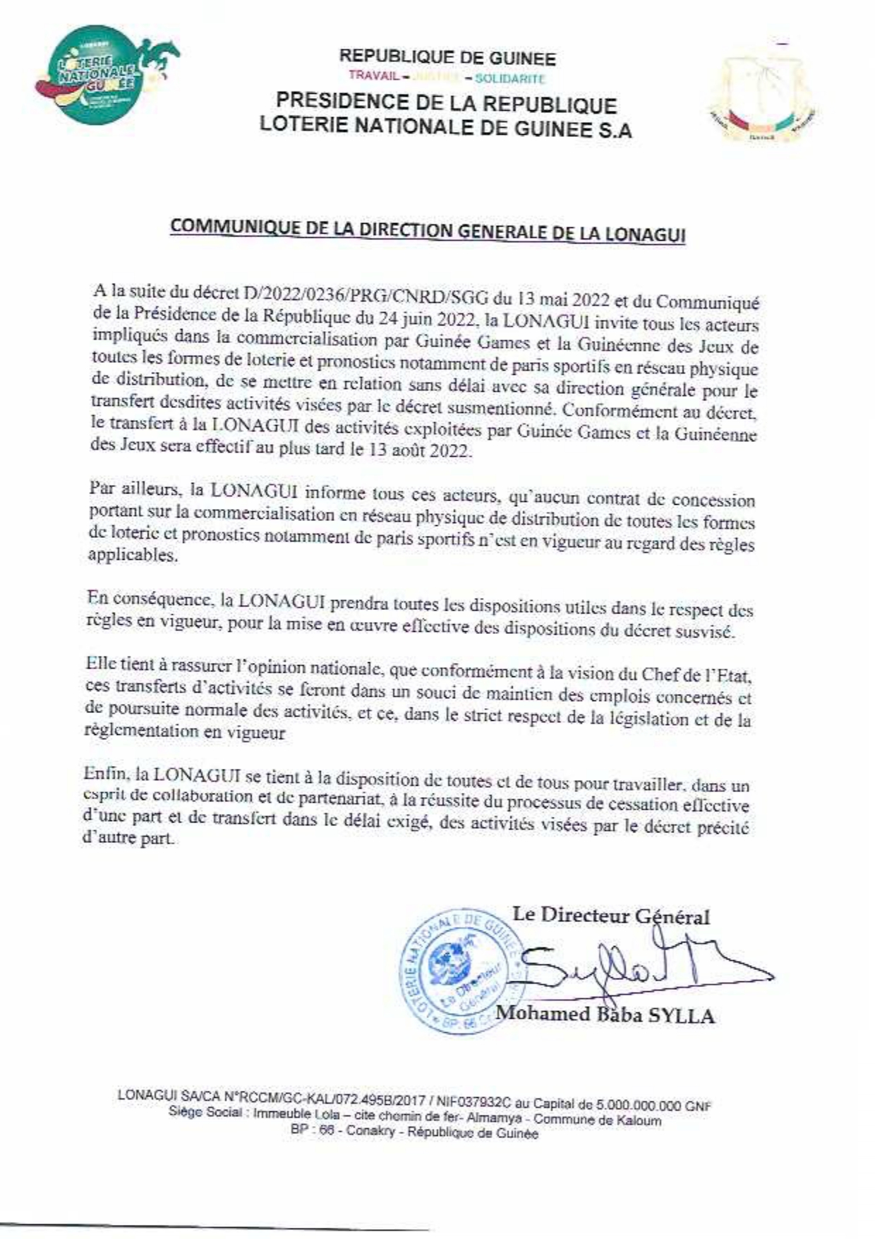 Dans un communiqué, la Loterie nationale de Guinée (LONAGUI S.A) a informé jeudi « qu’aucun contrat de concession portant sur la commercialisation en réseau physique de distribution de toutes les formes de loterie et pronostics notamment de paris sportifs n’est en vigueur au regard des règles applicables »