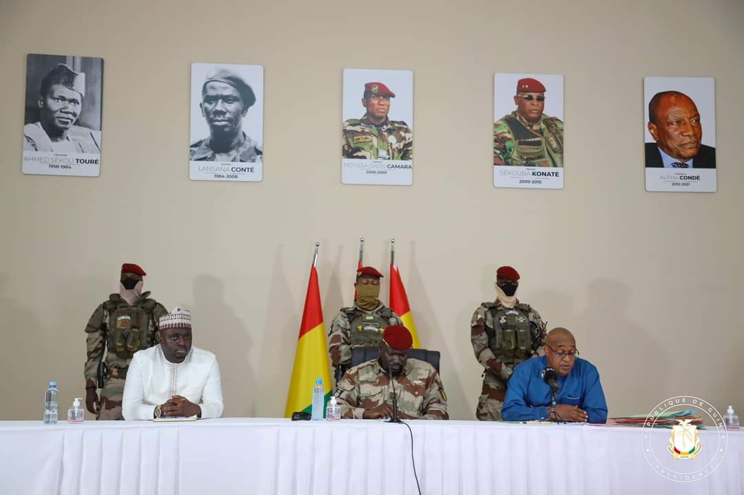 Aux premières heures du putsch, la junte a montré le colonel Mamadi Doumbouya avec les portraits du père fondateur de la Guinée Ahmed Sékou Touré et de son successeur général Lansana Conté, les deux dirigèrent le pays pendant un demi-siècle.