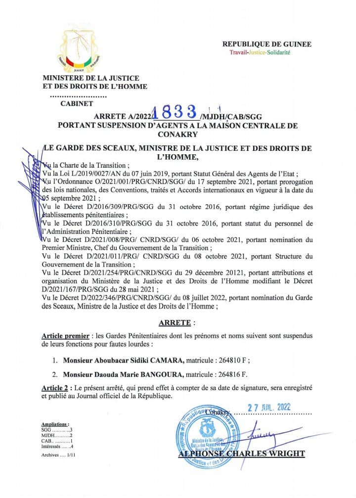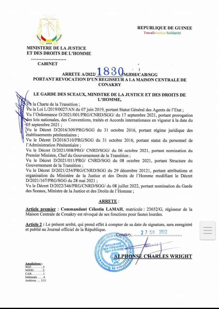 Suite à l’évasion de cinq détenus qui étaient en traitement au centre épidémiologique de Covid-19, le ministre de la Justice Alphone Charles Wright a révoqué le commandant Célestin Lamah, régisseur de la Maison centrale de Conakry pour « faute lourde »