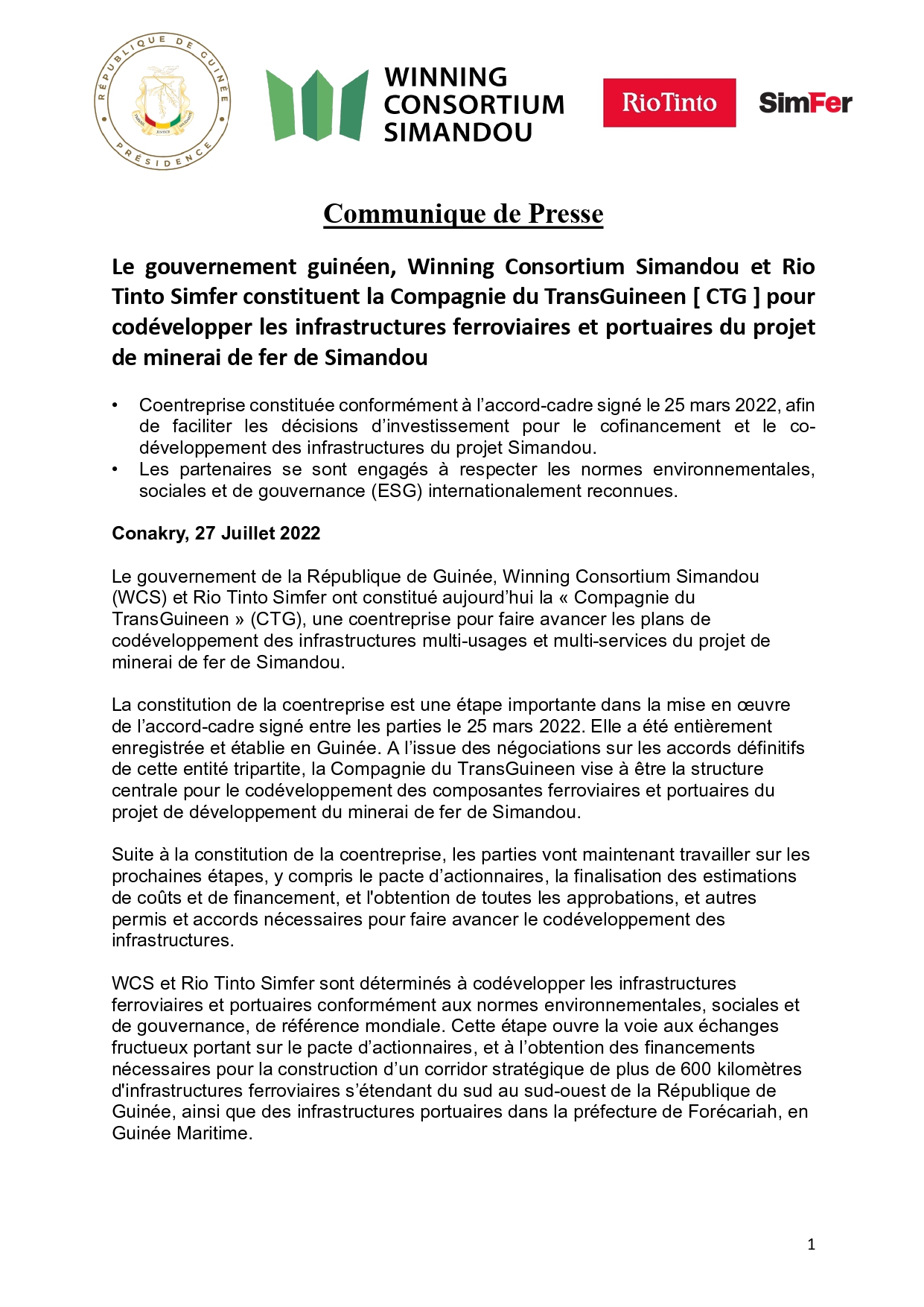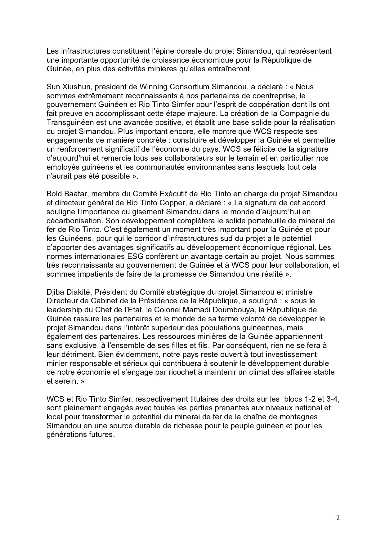 La Guinée exige et obtient la co-entreprise. Dans un communiqué transmis à Mediaguinee, il est annoncé que « le gouvernement guinéen, Winning Consortium Simandou et Rio Tinto Simfer constituent la Compagnie du TransGuinéen [CTG ] pour codévelopper les infrastructures ferroviaires et portuaires du projet de minerai de fer de Simandou »…