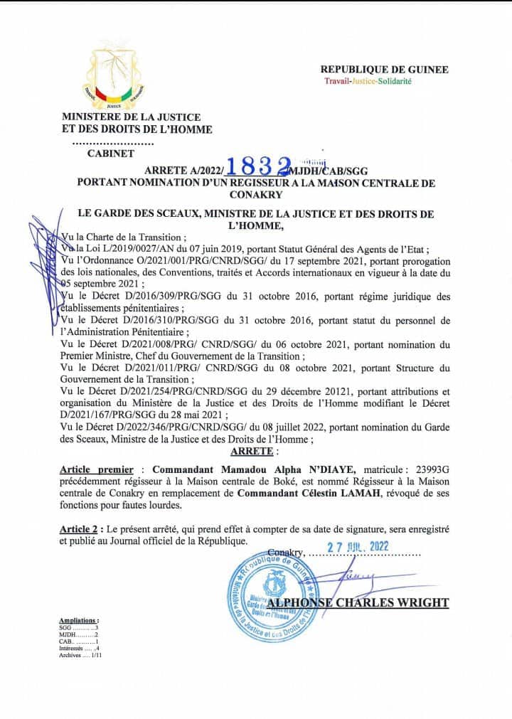 Suite à l’évasion de cinq détenus survenue dans la nuit du 26 juillet à la prison civile de Conakry, Le ministre de la Justice, garde des Sceaux, Alphonse Charles Wright a révoqué le commandant Célestin Lamah, régisseur de ladite Maison centrale de ses fonctions pour « faute lourde » et l’a remplacé par le commandant Mamadou Alpha Ndiaye, régisseur de la Maison centrale de Boké.