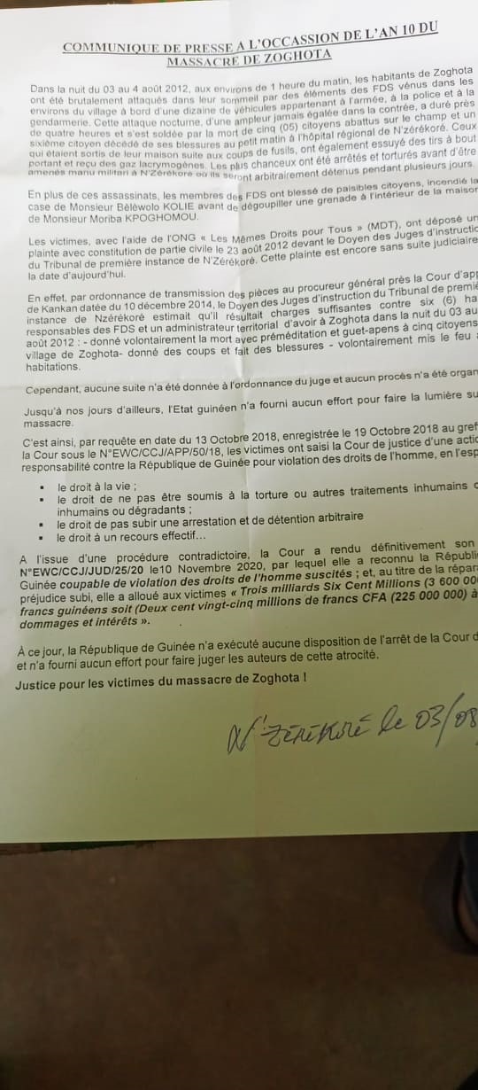 Ce massacre remonte depuis 2012, précisément dans la nuit du 3 au 4 août dans les bandes d’une heure du matin que les citoyens de Zogota ont été réveillés dans leur sommeil par les coups de fusils des forces de l’ordre.