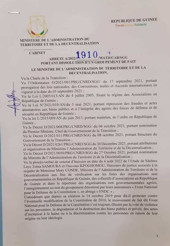 L’article Le gouvernement de la Transition dissout le FNDC est apparu en premier sur Guinee7.com.