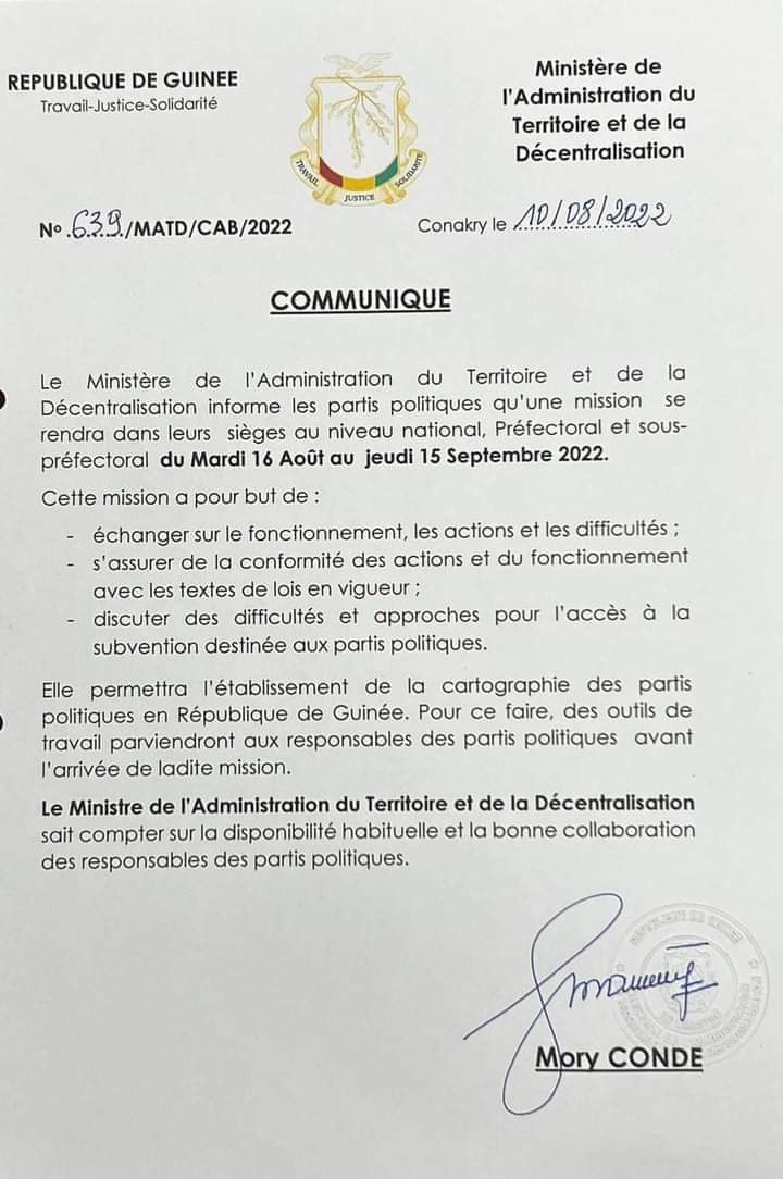 Après la dissolution du FNDC, le ministre de l’administration du territoire et de la Décentralisation Mory Condé annonce une mission d’un mois dans les sièges des partis politiques. Objectif : établissement de la cartographie des partis politiques en République de Guinée…