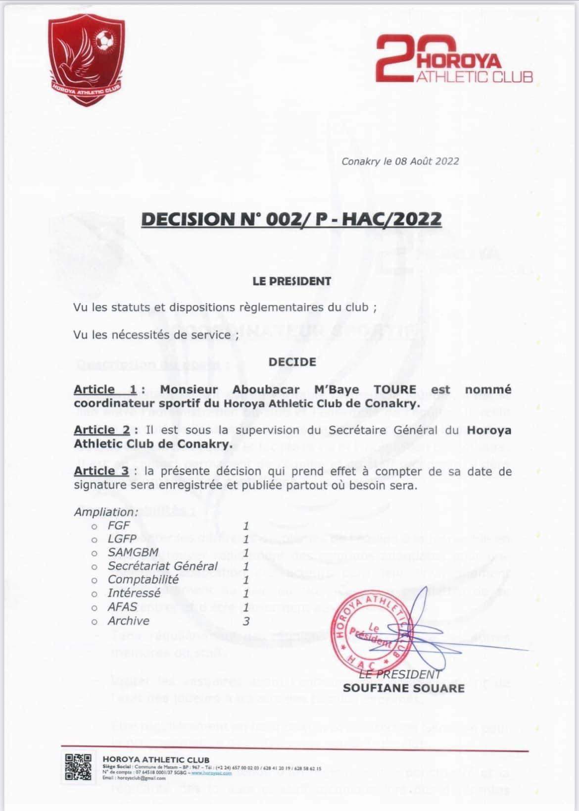 Ce dernier qui occupait jusque-là le poste de responsable de la cellule de recrutement du club champion de Guinée, est désormais le coordinateur sportif des Rouge et Blanc de Matam. « Il est sous la supervision du secrétaire général du Horoya AC « précise cette décision.