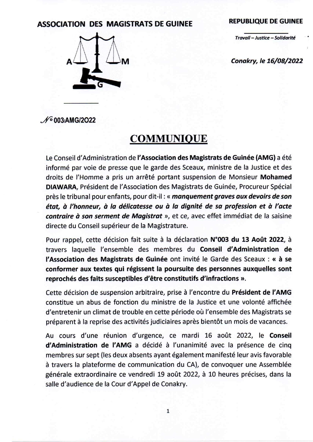 L’Association des Magistrats de Guinée (AMG) ne lâche pas le ministre de la Justice Alphonse Charles Wright. Son conseil d’administration (CA) a, dans un communiqué transmis à Mediaguinee, qualifié de « décision arbitraire » la suspension du président de l’AMG et invité tous les magistrats de Guinée, de la Cour Suprême, des deux Cours d’Appel (Conakry-Kankan), de la Cour des comptes, de la CRIEF, des tribunaux de première instance, du Tribunal pour enfants, du tribunal du Travail et des justices de paix, ainsi que ceux exercant dans les Tribunaux militaires et à l’Administration centrale à une assemblée générale le vendredi, 19 août prochain dans la salle d’audience de la Cour d’Appel de Conakry…