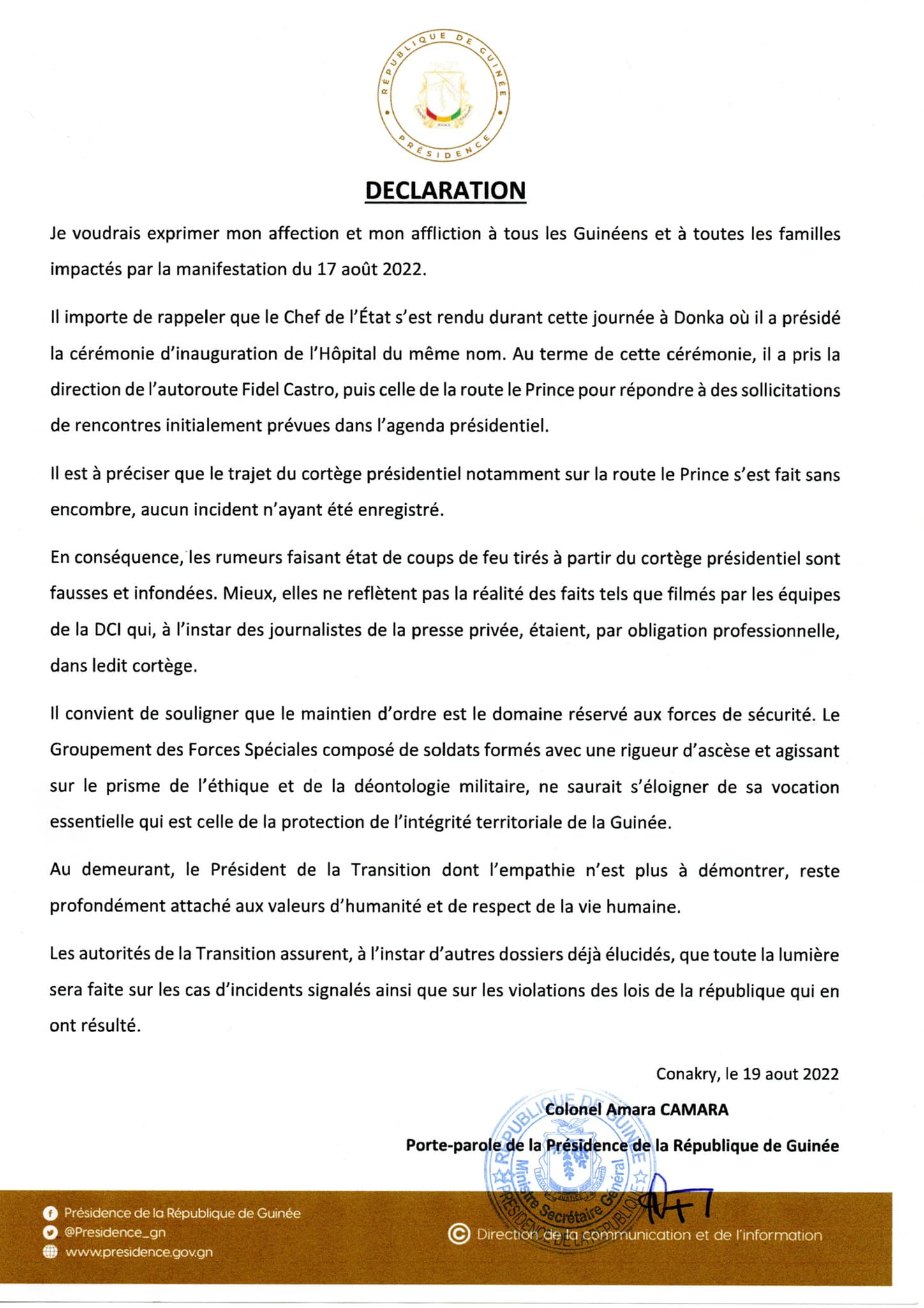 L’article Manifs du FNDC. « Les rumeurs faisant état de coups de feu tirés à partir du cortège présidentiel sont fausses et infondées », dément le Col. Amara est apparu en premier sur Guinee7.com.