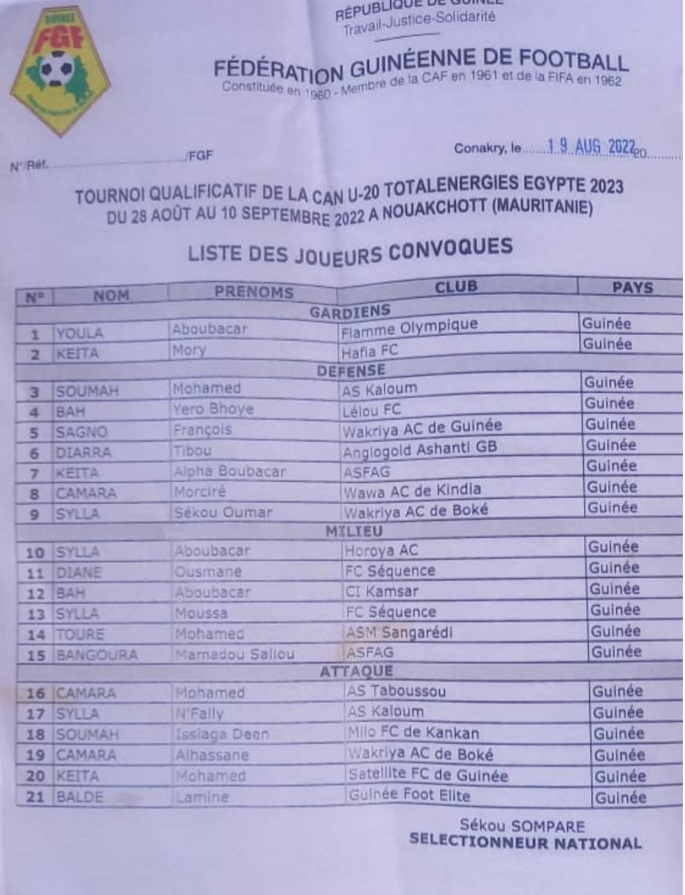 Ci-dessous, la liste des 21 joueurs sélectionnés, Syli U-20