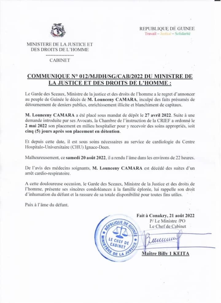 Selon le ministère, « Louceny CAMARA a été placé sous mandat de dépôt le 27 avril 2022. Suite à une demande introduite par ses Avocats, la Chambre de l’instruction de la CRIEF a ordonné le 2 mai 2022 son placement en milieu hospitalier pour y recevoir des soins appropriés, soit cinq (5) jours après son placement en détention. Et depuis cette date, il est sous soins nécessaires au service de cardiologie du Centre Hospitalo-Universitaire (CHU) Ignace-Deen. Malheureusement, ce samedi 20 août 2022, il a rendu l’âme dans les environs de 22 heures ». Lire ci-dessous la déclaration.